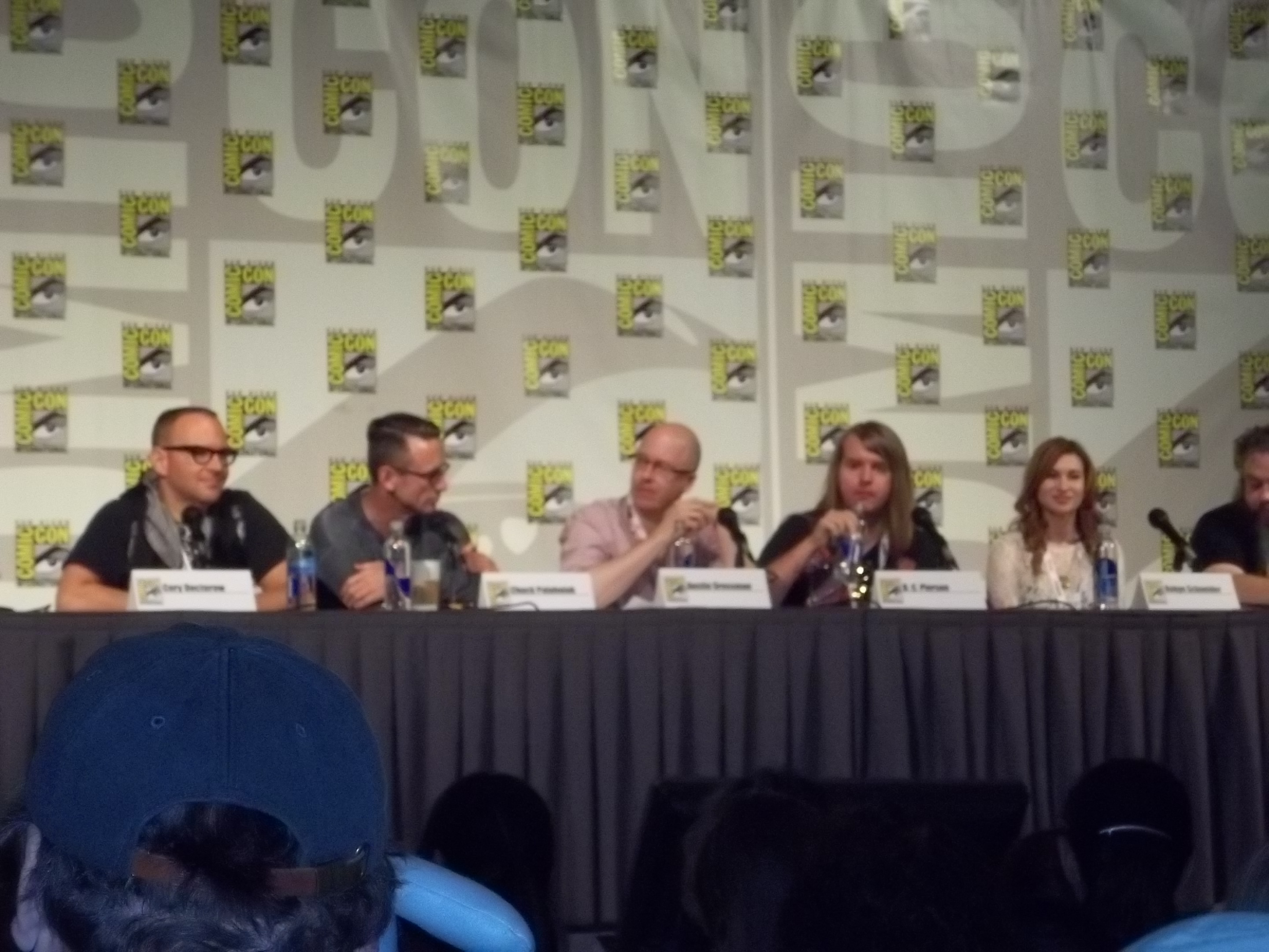 The description in the official guide didn’t give me much to go on: “Everyone knows that published science fiction authors reign on the Geek Heirarchy charts, because the Internet tells us so! Join panelists as the genre’s top names in publishing celebrate all things geeky and nerdy, with Charlie Jane Anders of io9.com. Geek out with Cory Doctorow (The Rapture of the Nerds),Chuck Palahniuk (Doomed), Patrick Rothfuss (The Name of the Wind), Austin Grossman (You), D. C. Pierson (Crap Kingdom), and Robyn Schneider (The Beginning of Everything). “