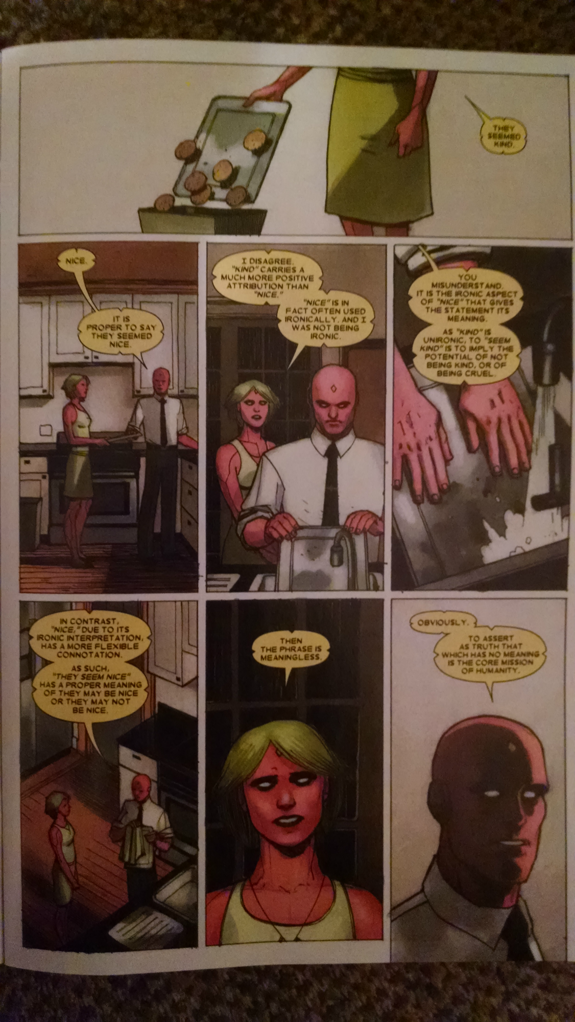 Calling to mind the old Vision and Scarlet Witch series that I loved so much from the 80s/90s, The Vision centers on the day-to-day life of The Vision as he (again) tries to establish a normal life in the suburbs. In the prior two series, he was trying to settle into suburbia with his wife, the Scarlet Witch, while soap opera-level drama unfolded – both superhuman (like Magento showing up for Thanksgiving dinner) and mundane (like Quicksilver’s wife cheating on him with a local real estate agent).